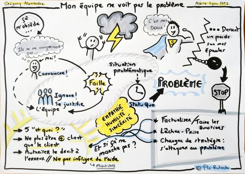 Le 4 juin 2021, je donnais ma conférence « Mon équipe ne voit pas le problème » où je présentais ces situations dans lesquelles nous voyons un dysfonctionnement s’opérer devant nous (un bug client qui reste incorrigé longtemps, une équipe qui communique mal pendant les réunions, une équipe qui saute ses rétrospectives…). On observe donc ce dysfonctionnement, on en parle à l’équipe et la réponse obtenue ne nous convient pas (l’équipe minimise, elle esquive, elle se justifie…).