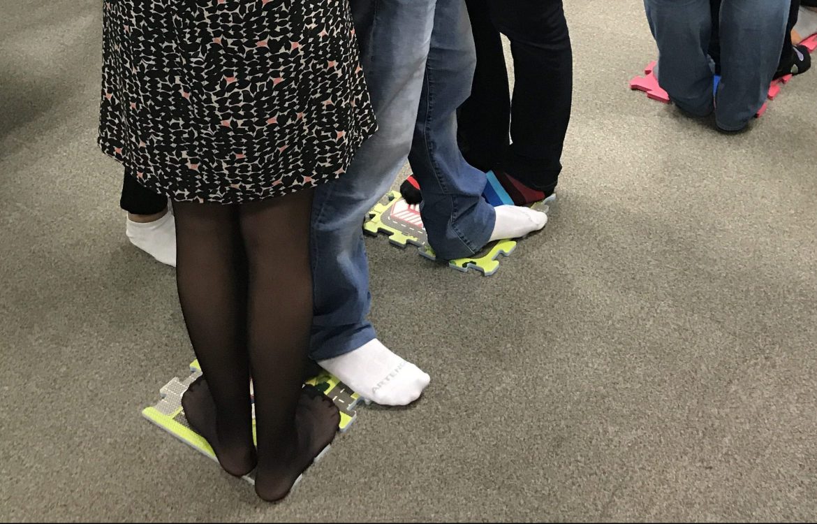 Très rapidement, mon esprit s’est tourné vers l’atelier SOS du Titanic : perdus dans l’atlantique jeu créé par Xavier Warzee et Philippe Houssin en 2003 (j’y étais) et où les joueurs et joueuses disposés sur un tapis très souple doivent le retourner sans en sortir.